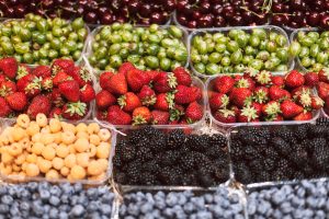 Close up stand with variety of beautiful fresh fruits in grocery